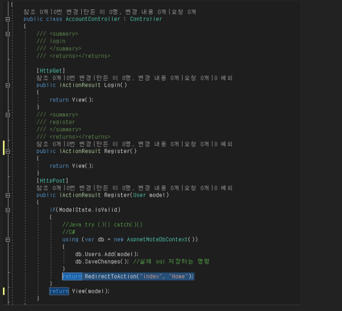 return RedirectToAction("index", "Home"); -> return시 Resister view에서 다른 view로 전달