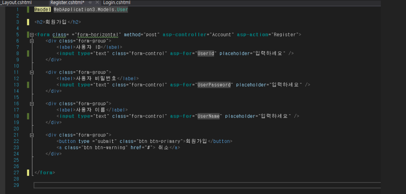3. attribute 설정 asp-for --> 입력받은 값이 어떤 값인지 정의(id,비밀번호 이름 등)