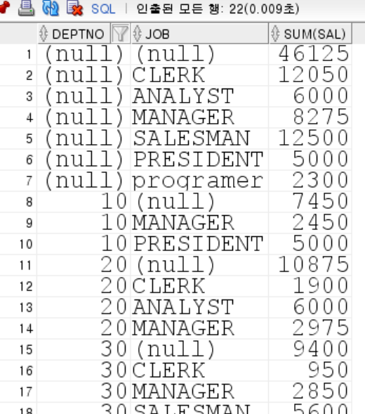 select deptno, job, sum(sal)