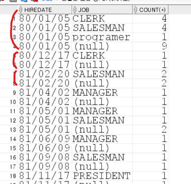 hiredate, job 데이터를 볼 때 hiredate가 앞에 있으므로 hiredate 기준으로 rollup 함수가 사용됨